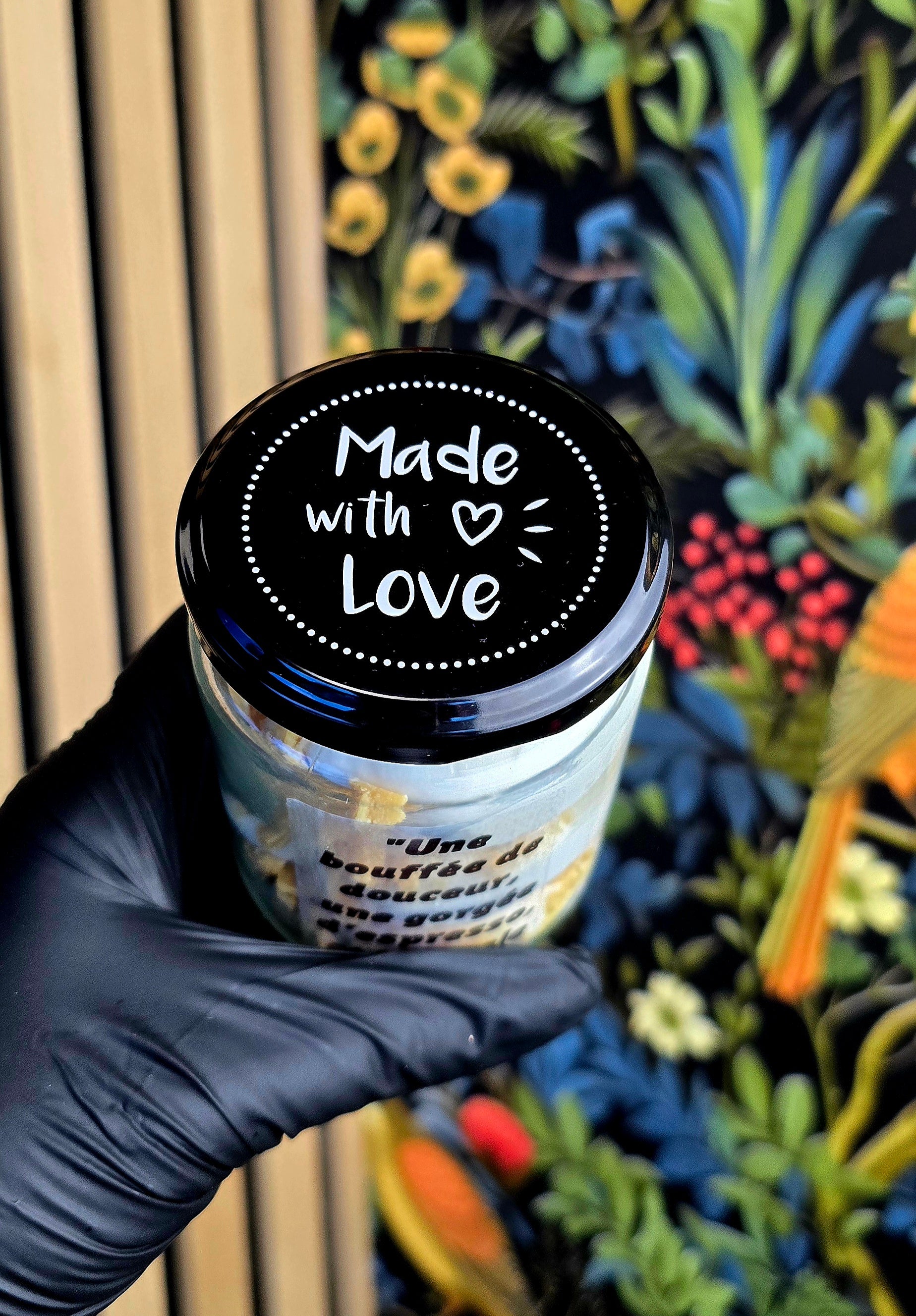 Coulée à la main avec amour, cette bougie est réalisée à partir de cire de soja et d’huile de Grasse, pour une combustion propre et un parfum intense.